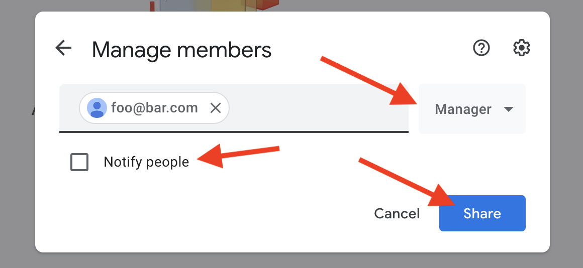 3. Choose "Manager" from the dropdown on the right, uncheck the "Notify people" box if you wish, and click "Share".
